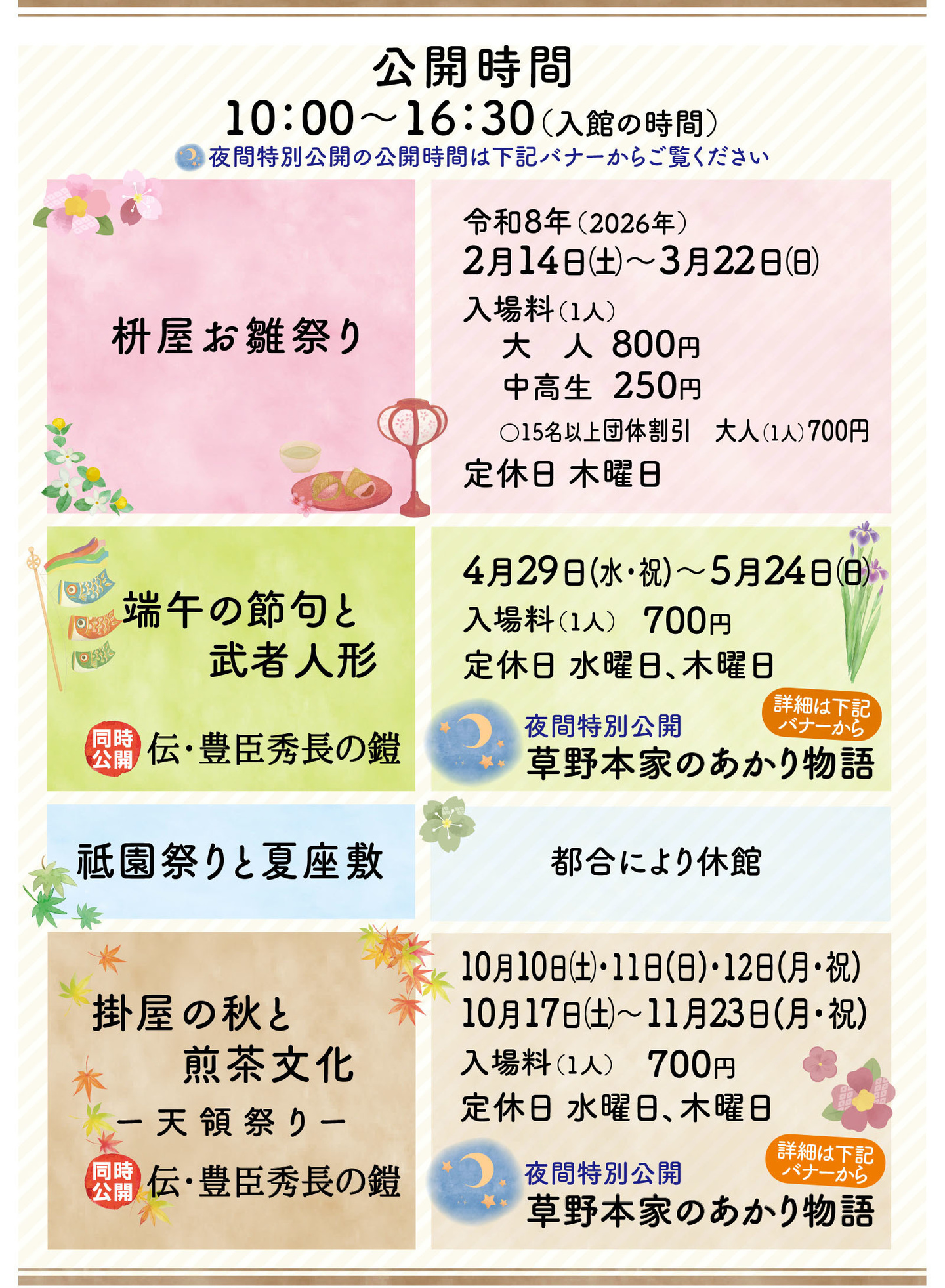 草野本家の一般公開は年4回で、「お雛祭り」の他、「端午の節句」「日田川開き観光祭」「日田祇園祭」「天領祭り」の時期に公開いたしております。