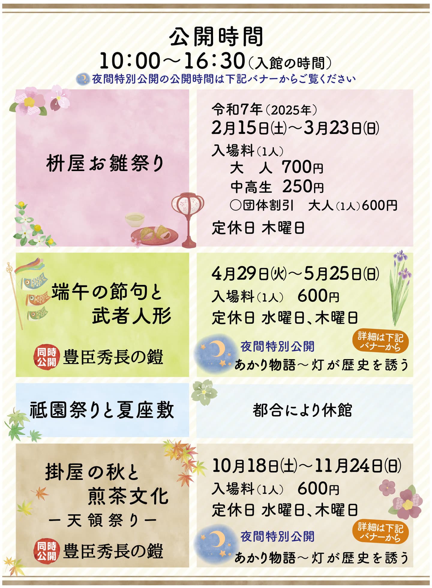 草野本家の一般公開は年4回で、「お雛祭り」の他、「端午の節句」「日田川開き観光祭」「日田祇園祭」「天領祭り」の時期に公開いたしております。